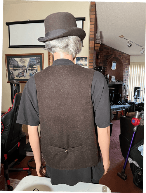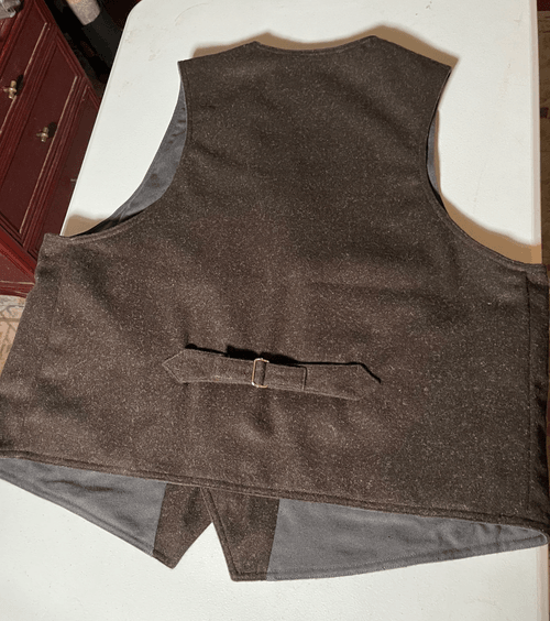New Frontier Classics Men dark brown wool blend Gunfighters Vest - Perfect color for reenactment groups who want you to blend in with the rest of the members. Four pockets make it extra handy, notched collar and adjustable back strap. Tags have been removed, so we are taking 10 % off the normal sales price.