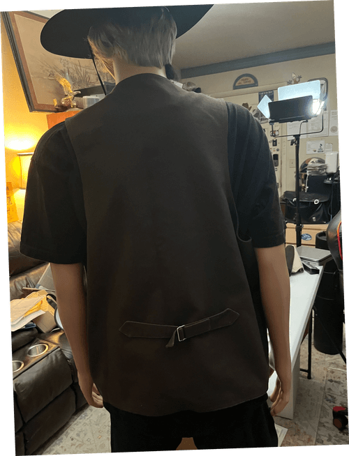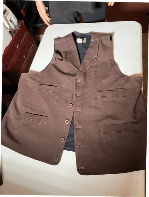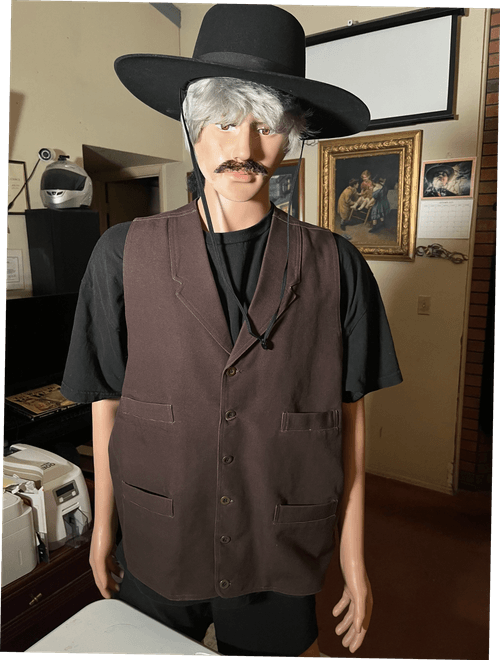 New Frontier Classics Men Solid Brown Gunfighters Vest - Perfect color for reenactment groups who want you to blend in with the rest of the members. Four pockets, notched collar and adjustable back strap. Tags have been removed, so we are taking 10 % off the normal sales price.