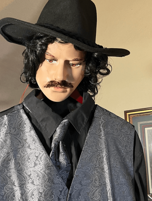 John Wesley Hardin would just as soon shoot you then befriend you. A hardened criminal of the old west who put a lot of people in their graves early. Here we have a costume of John, everything you need in one box. Only the boots are missing.