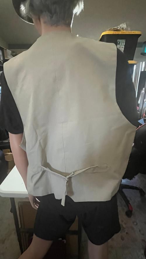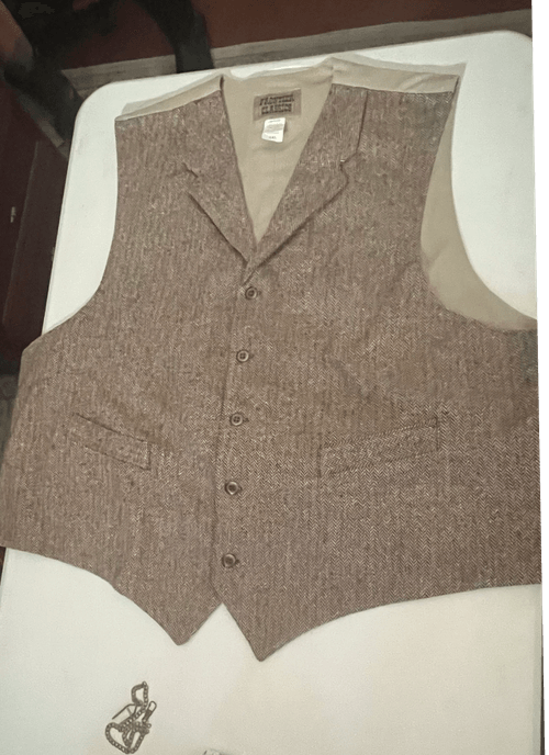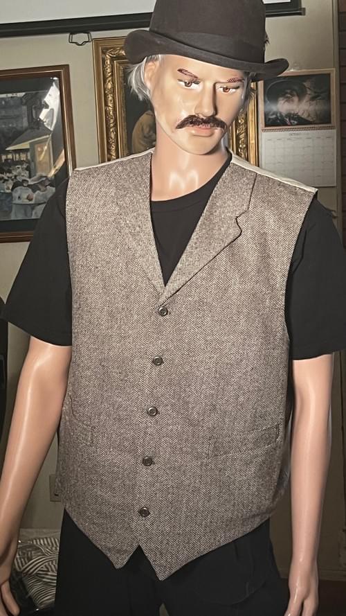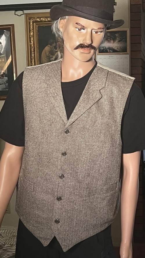 New Frontier Classics Men light tan colored herringbone pattern - Gunfighters Vest - Perfect color for reenactment groups who want you to blend in with the rest of the members. Two pockets, notched collar and adjustable back strap. Tags have been removed, so we are taking 10 % off the normal sales price.