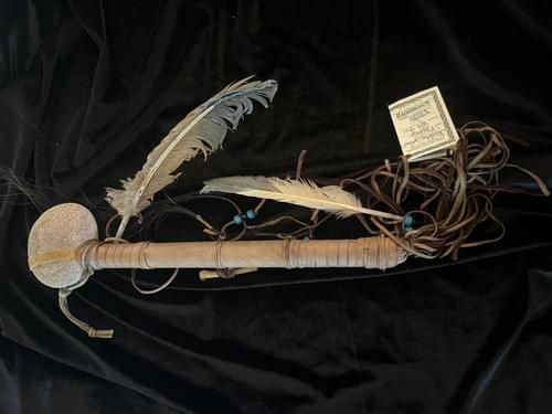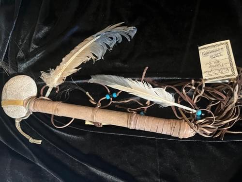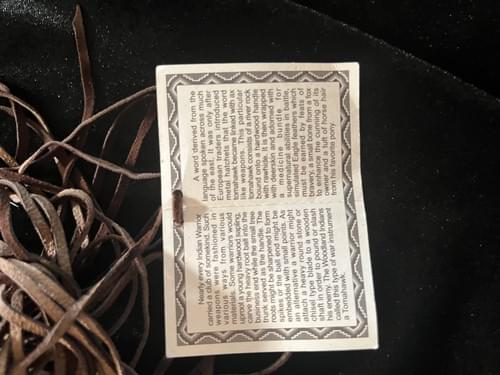 Beautiful replica of a real American Indian war hatchet. Same as new. (Well the rock is obviously one that has probably been around a few years I guess) Beautiful leather, hair, feather and beads here! For your play, movie, skit or home decor. Price tag is old, cost is more now.
